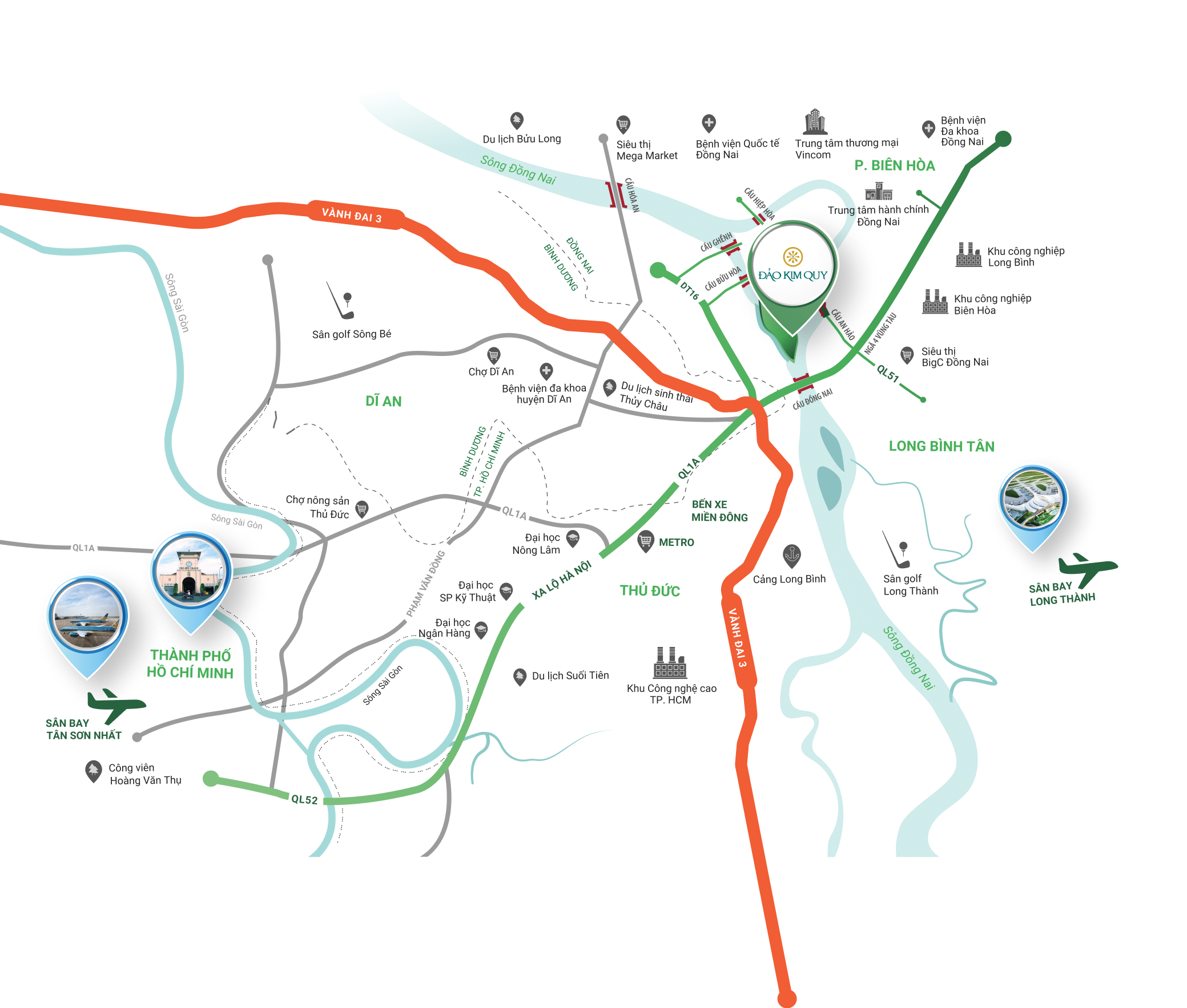 Ngã 3 Vũng Tàu, các Khu công nghệ cao, TT Hành chính Đồng Nai và TP. Hồ Chí Minh